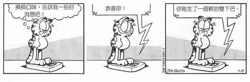 加菲猫对过重的定义就是叉子上叉的食物多到他拿不动。不过隔一阵子,他还是得面对自己太胖的现实,通常是由专会说尖酸刻薄话的浴室磅秤向他揭发残酷的真相。几年来,这位公正严明的电子判官,针对加菲猫的肥油作了不少努力。但不论他怎么机智幽默都赢不了;随时会有一只肥猫站在它脸上的命运是不可能更改的。