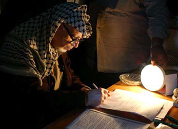 2002年9月23日,阿拉法特在拉姆安拉被以军围困的官邸内挑灯批阅文件