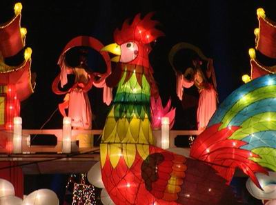 因为今年是中国农历鸡年,所以“鸡”造型的灯非常多,人们可以看到许多千姿百态的公鸡、母鸡和小鸡造型的灯。“龙”是中华民族精神的象征,所以每年的灯会上都会有不少以“龙”为主题的灯。另外,还有象征着吉祥、快乐的佛、象征中国传统艺术的京剧脸谱、古香古色的仿古宫灯等。