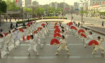 最后出场的是河西区太极拳队带来的“太极功夫扇”,参加展示30人。队伍成立于1997年,现在已经发展到1000多人,是一支规模较大的晨练队,曾在市、区级大型比赛中获得过集体、个人一、二、三等奖项十几次。队员平均年龄60岁。由国家级社会体育指导员担任总教练,以科学锻炼科学健身为目的。
