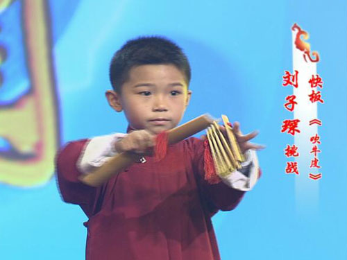 第一位挑战者耿立祥小朋友,从沧州远道而来参加节目。栏目组介绍快板名家李少杰为他指导。严师出高徒,这小家伙初生牛犊不怕虎,非常可爱。他将挑战一段快板《糊涂县官》。