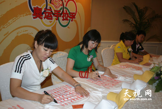 | 到会奥运明星钱红、龚睿那、马燕红、董炯(由左至右)为幸运观众签名 |
