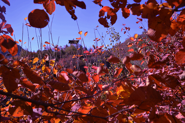 一夜的秋风扫过,深秋的坡峰岭碧空如洗,金色的阳光,湛蓝的天空,青黛色的远山、苍绿的松柏,丹霞般的红叶,交相辉映,宛如当空舞动的彩练,格外耀眼悦目,令人心潮涌动,流连忘返。