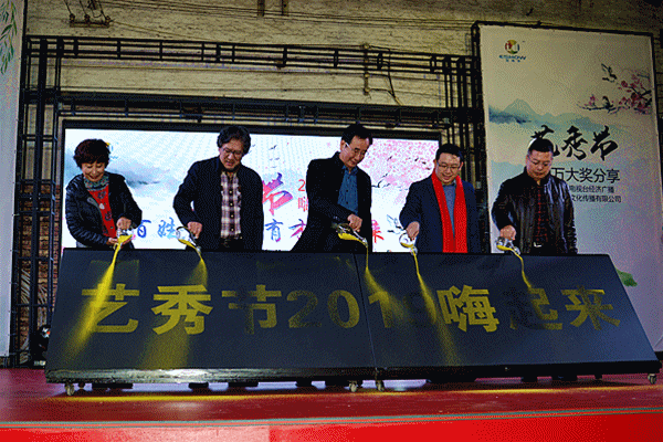天津广播电视台经济广播总监付振旺、天津兰心阁文化传播有限公司总经理杨可佳、天津广播电视台经济广播副总监李志强、节目部主任乔振忠、主持人黄浦共同洒金,启动2019艺秀节!