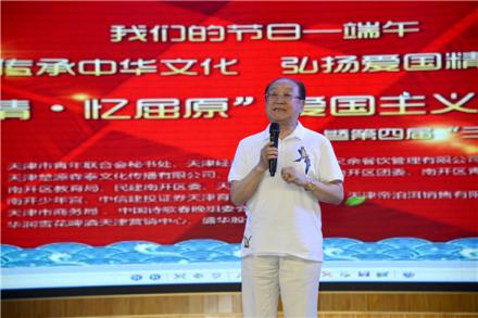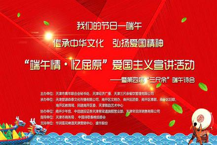 爱国主义是一种崇高的思想品德,是中华民族几千年来形成的优良传统和伟大的民族精神。时临仲夏,岁至端午,纪念爱国诗人屈原成为每逢此时华夏儿女的一种民族自觉。由天津市青年联合会秘书处、天津经济广播、天津三尺余餐饮管理有限公司共同主办,由天津楚源森泰文化传播有限公司、南开区文明办、南开区团委、南开区青联、南开区妇联、南开区教育局、民建南开区委、天津雅韵艺术中心承办的“传承中华文化,弘扬爱国精神——“端午情·忆屈原”爱国主义宣讲活动暨第四届“三尺余”端午诗会在南开少年宫隆重举行。