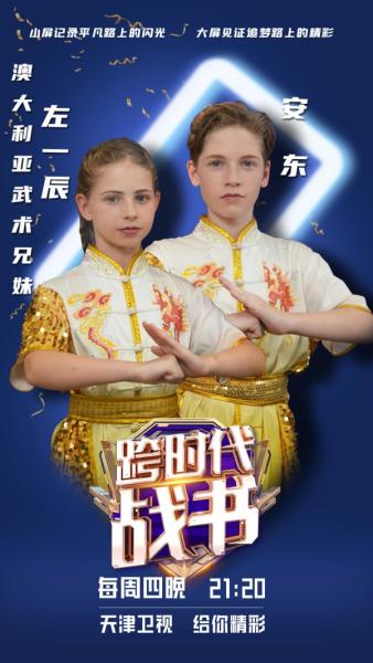 来自澳大利亚的安东和妹妹左一辰在山东威海生活,哥哥安东从5岁开始接触中国武术习武7年,妹妹看到哥哥练习也对武术产生兴趣。兄妹俩各有所长,练习也十分刻苦,二人的老师丁炳强说:“安东第一次上课就对武术着迷,想像李小龙一样,有一次他胳膊受伤了他就带伤练腿功,他的这种尚武精神也值得我们学习。”兄妹二人共同表示“我们不仅学会了中国武术技巧,还从中学到了尊师友爱、磨炼意志、坚持隐忍的武术精神。”兄妹俩的《兵器》表演令在场嘉宾叹为观止、大呼过瘾,更多精彩内容敬请收看12月12日21:20天津卫视《跨时代战书》。